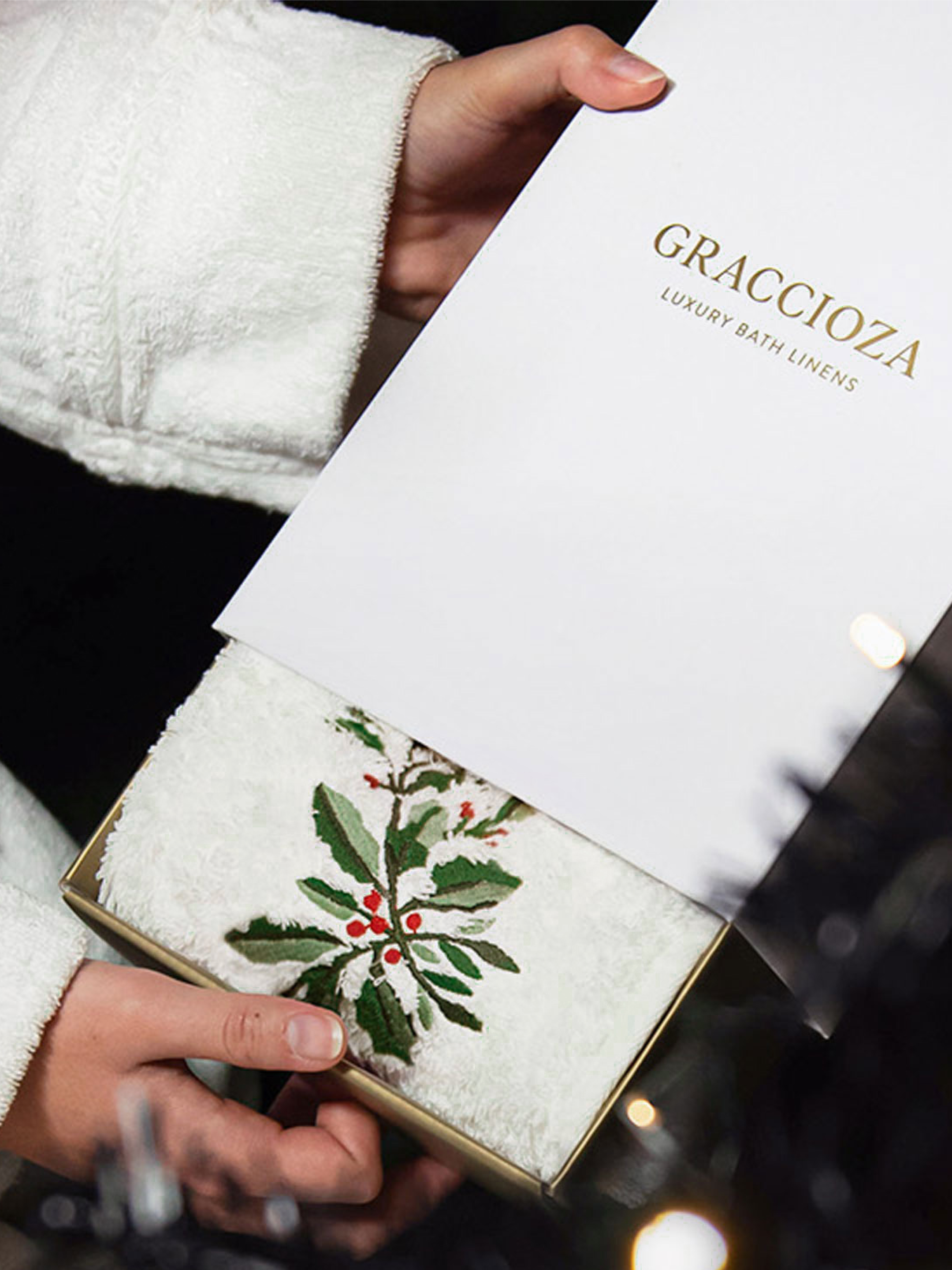 The Festive collection features warm-toned holly motifs that bring a cozy, inviting holiday spirit to any home.
